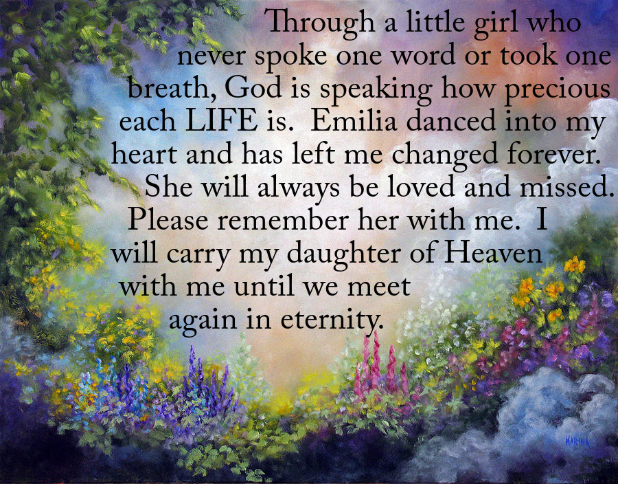 Day 30. Your Grief – Tell The World – Emilia Madeleine Rose Clough – Through a little girl who never spoke one word or took one breath, God is speaking how precious each LIFE is. Emilia danced into my heart and has left me changed forever. She will always be loved and missed. Please remember her with me. I will carry my daughter of Heaven with me until we meet again in eternity. And when my life on earth has ended, please remind the world that my daughter existed.
