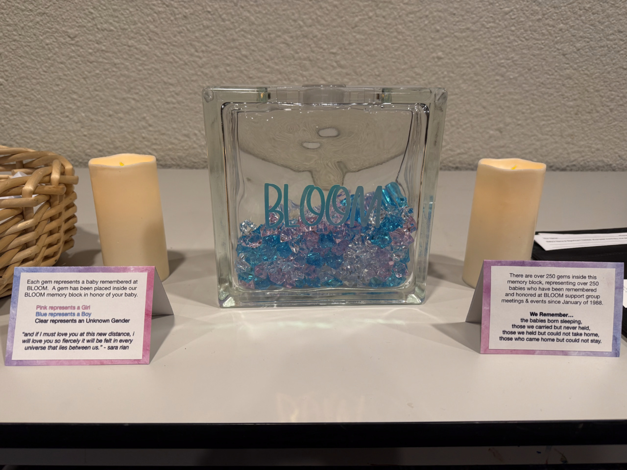 🎄 Our Glass BLOOM Block is filled with over 250 gems, colored either Pink, Blue, or Crystal Clear. Each gem represents a baby remembered at one of our meetings/events dating back to 1988. Pink representing all the baby girls, blue representing the baby boys, and crystal clear representing the babies whose genders remain unknown. 35 years later after our humble support group begun and we still continue to recognize, remember, and honor the babies who are no longer with us, but forever a part of the BLOOM family.