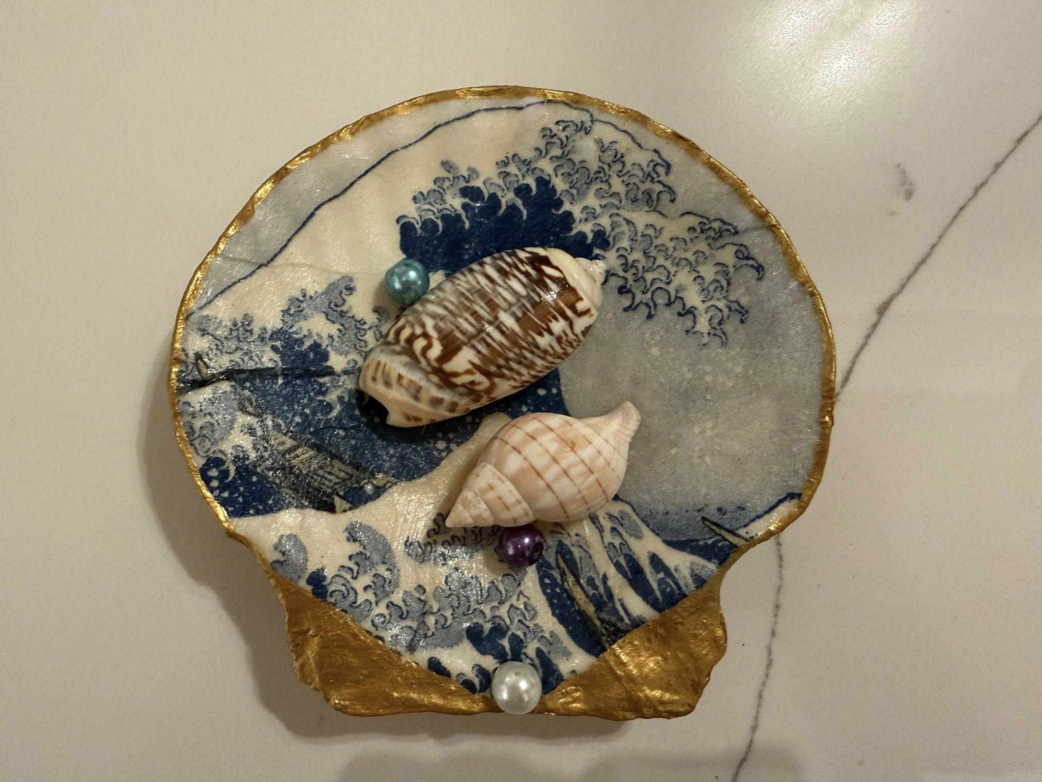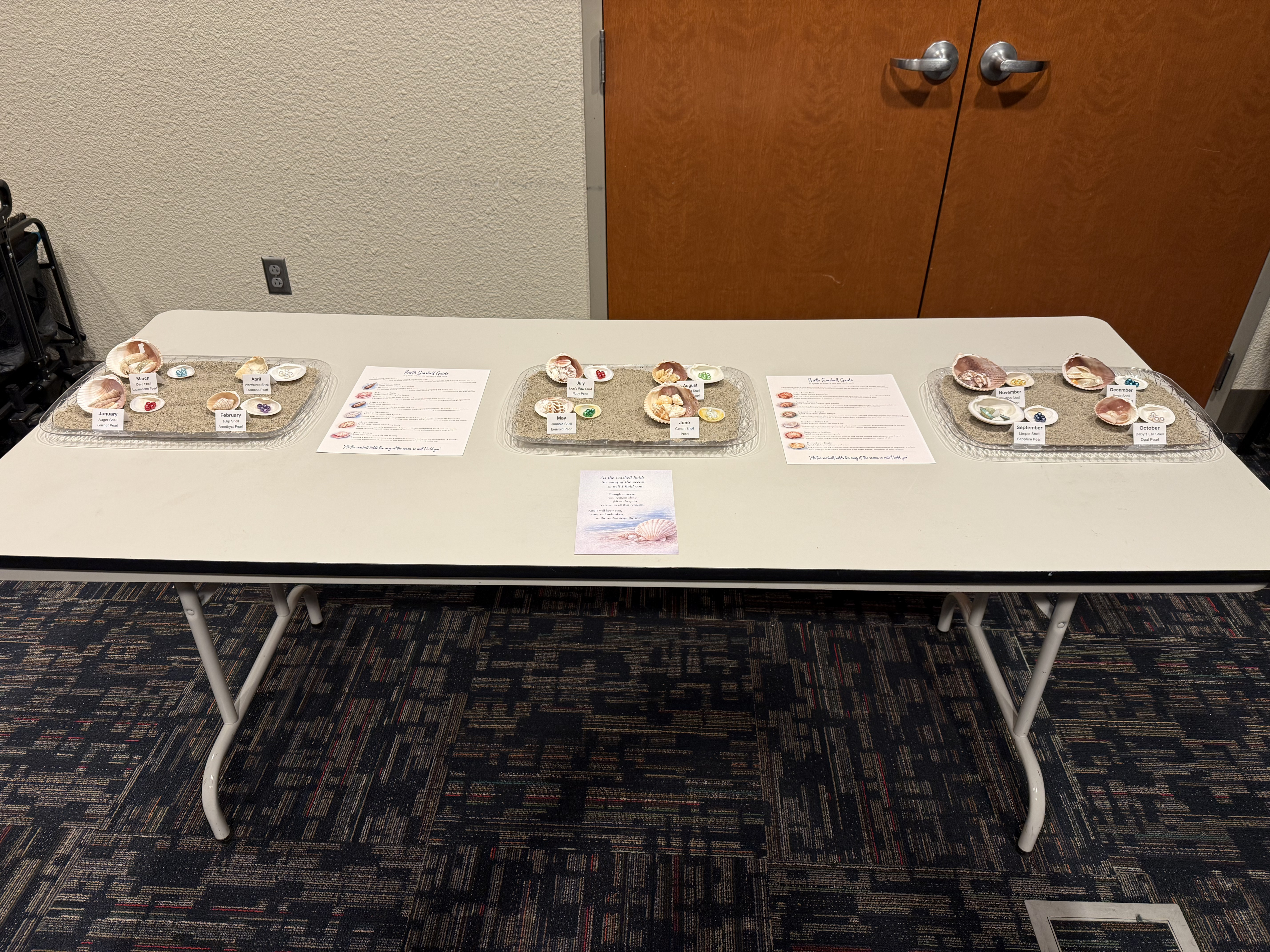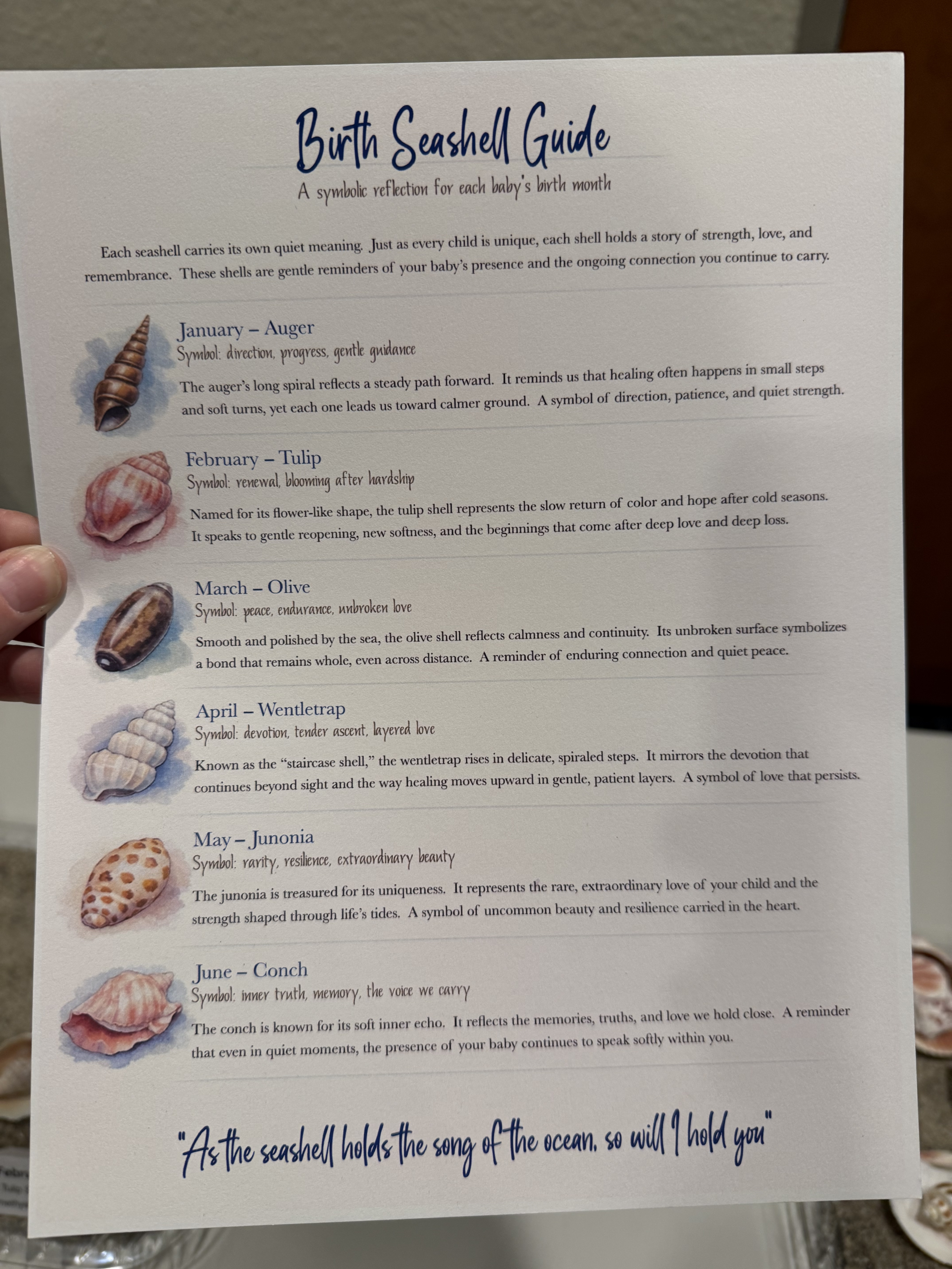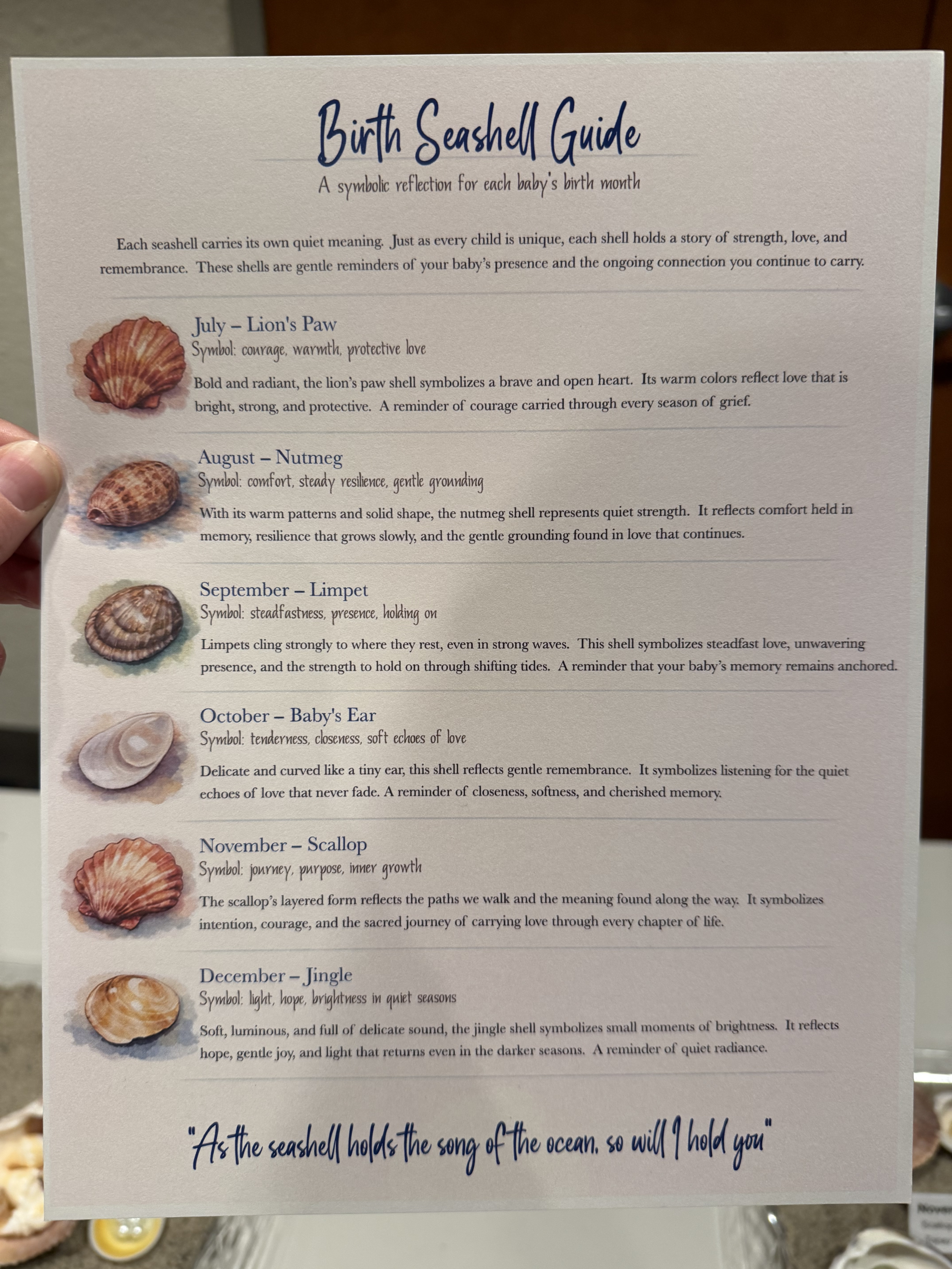 Last month at BLOOM, each person in attendance was given a large seashell to decoupage an ocean wave onto. Much like gemstones, each month of the year has its own โbirth shellโ – a shell that carries meaning and symbolism for those born under it. Each parent was able to go home with the birth shell of their child and a pearl, to place inside their โshell that holds a wave,โ as a reminder that love still remains.