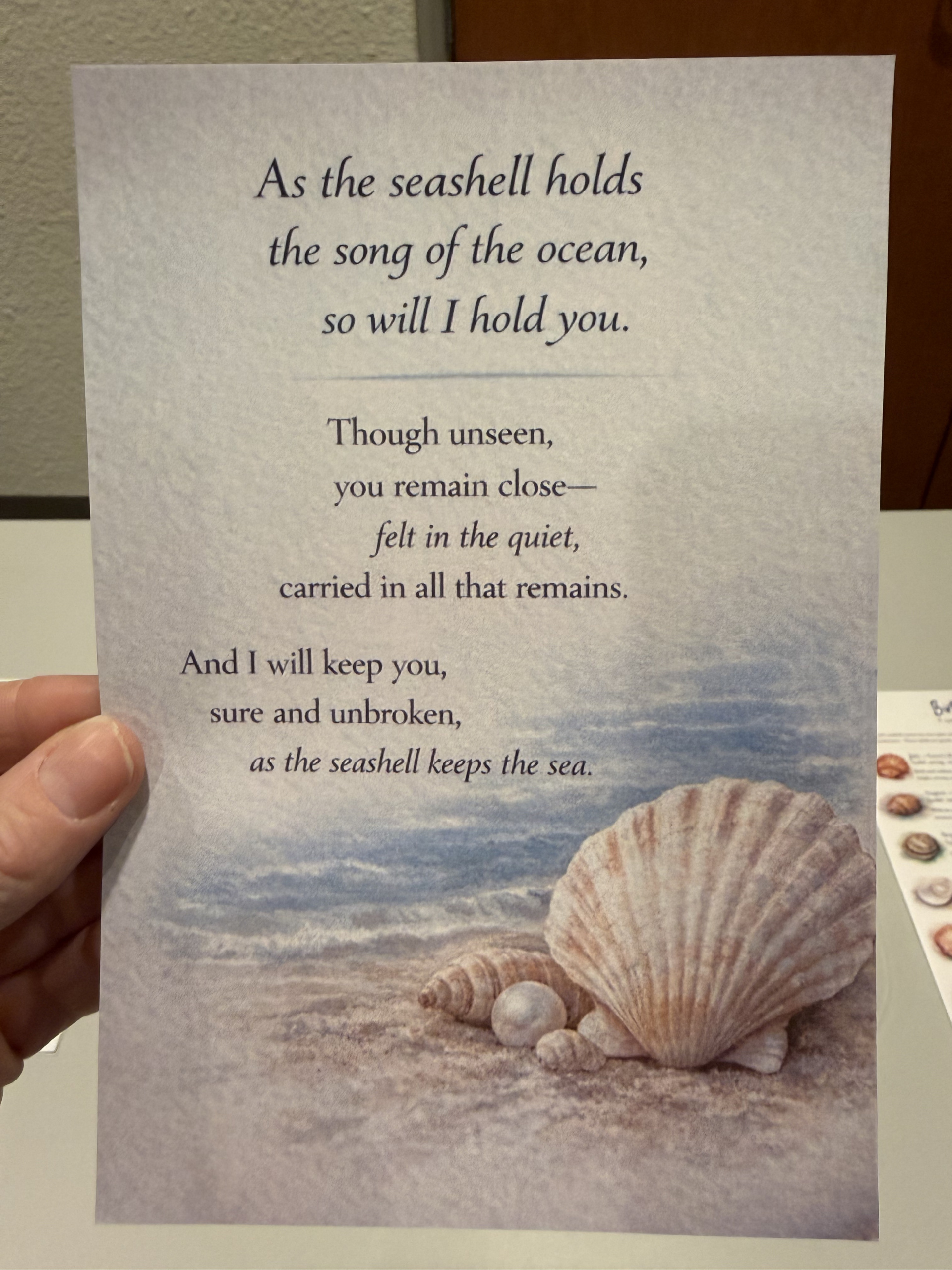 Along the shore, grief leaves behind seashells. Small reminders of love, memory, and connection. Some are smooth from time and touch, others fragile and sharp-edged. We donโt choose when we find them, but when we do, they remind us of what was held, what was lost, and what still remains.